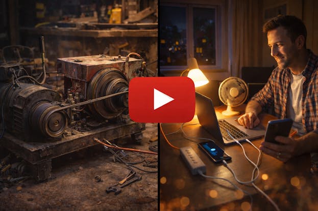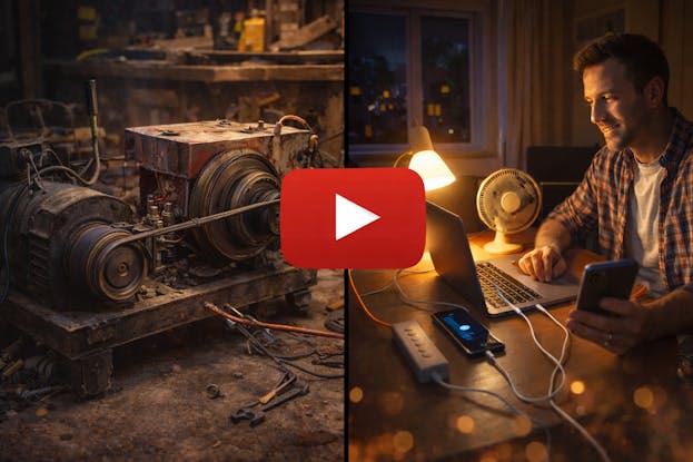 An off grid engineer studying emergency preparedness began sharing a compact backup power setup designed for everyday situations. Create a way to produce and store small amounts of electricity that can help keep essential devices running during outages, camping trips, or travel.